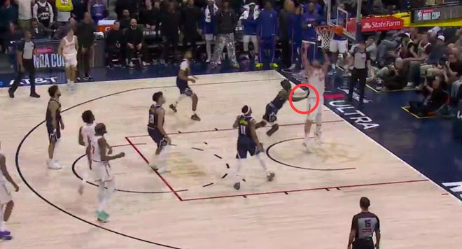 加時賽還剩1分08秒,掘金隊側(cè)翼球員小哈達威在爭搶球權(quán)時對申京犯規(guī),裁判當(dāng)時未作吹罰;